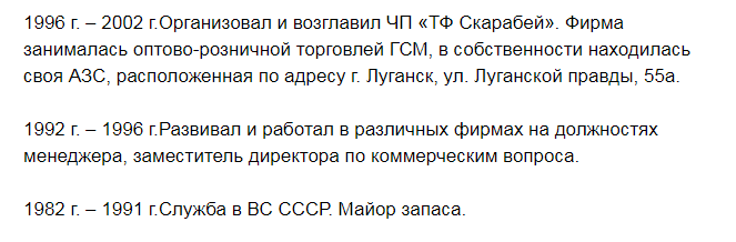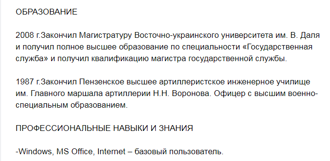 Также Плотницкий описал свой трудовой путь до 2012 года и указал информацию о полученном им высшем образовании. Согласно резюме, в 1987 году он закончил Пензенское высшее артиллеристское инженерное училище им. Главного маршала артиллерии Н.Н. Воронова. А в 2008 году окончил Магистратуру Восточно-украинского университета им. В. Даля в Луганске. Там он стал магистром государственной службы.