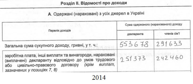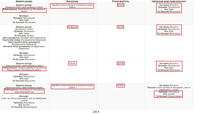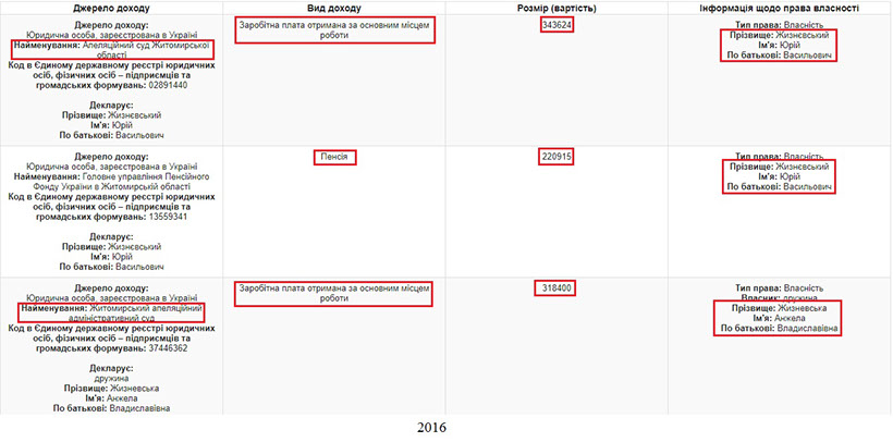 Дослідивши декларації суддівського подружжя за 2013, 2014, 2015 та 2016 роки, ми бачимо, що, крім суддівської заробітної плати та регулярної матеріальної допомоги, ще одним видом доходу є чимала пенсія, яку отримує Юрій Васильович. Загалом за 4 роки Юрій Жизнєвський та його дружина задекларували 3,8 млн грн доходу.
