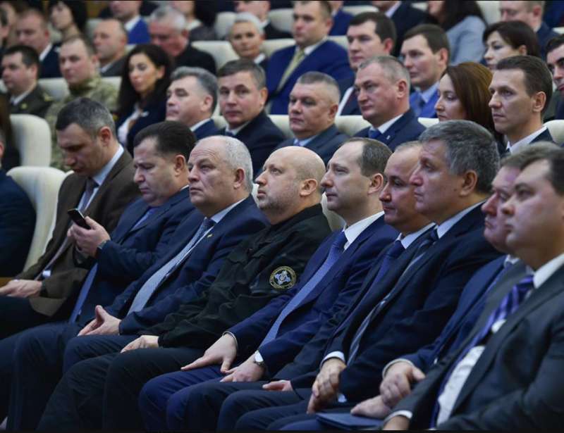 В зале также присутствовали мэр Киева Виталий Кличко, глава Минобороны Степан Полторак, глава МВД Арсен Аваков, секретарь СНБО Александр Турчинов.