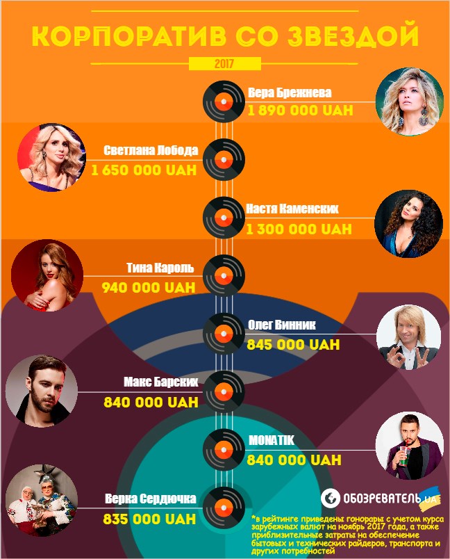 Первую пятерку с гонораром в $30 тыс. закрыл украинский сердцеед Олег Винник. Затраты на райдеры его представители оценивают в $1,5-2 тыс.