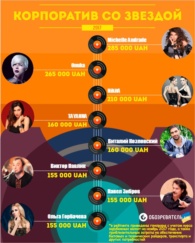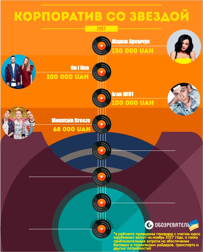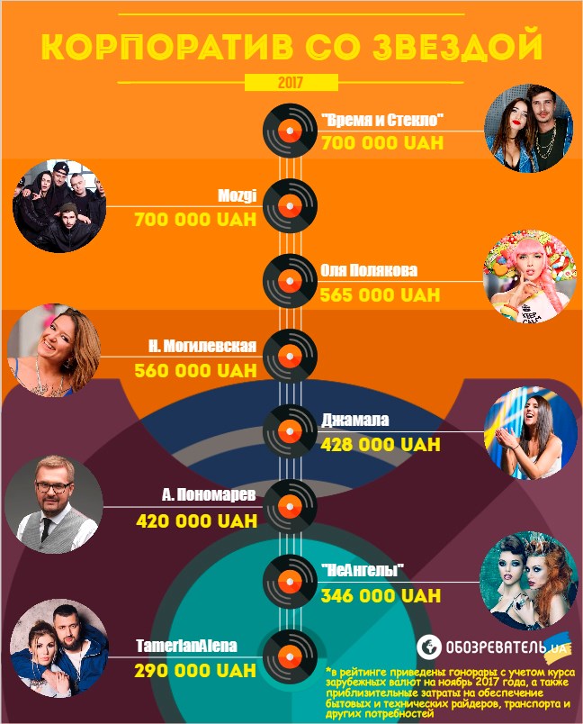 Под конец плодотворного 2017 года они же, как упоминалось выше, подскочили едва ли не вдвое, некоторые звезды перекочевали с гривен на доллары, а кто-то и на евро. Большинство артистов предпочитают только наличный расчет, который можно осуществить в их представительствах. Если же вы решите платить "по безналу", смело добавляйте к сумме гонорара 5-7%.