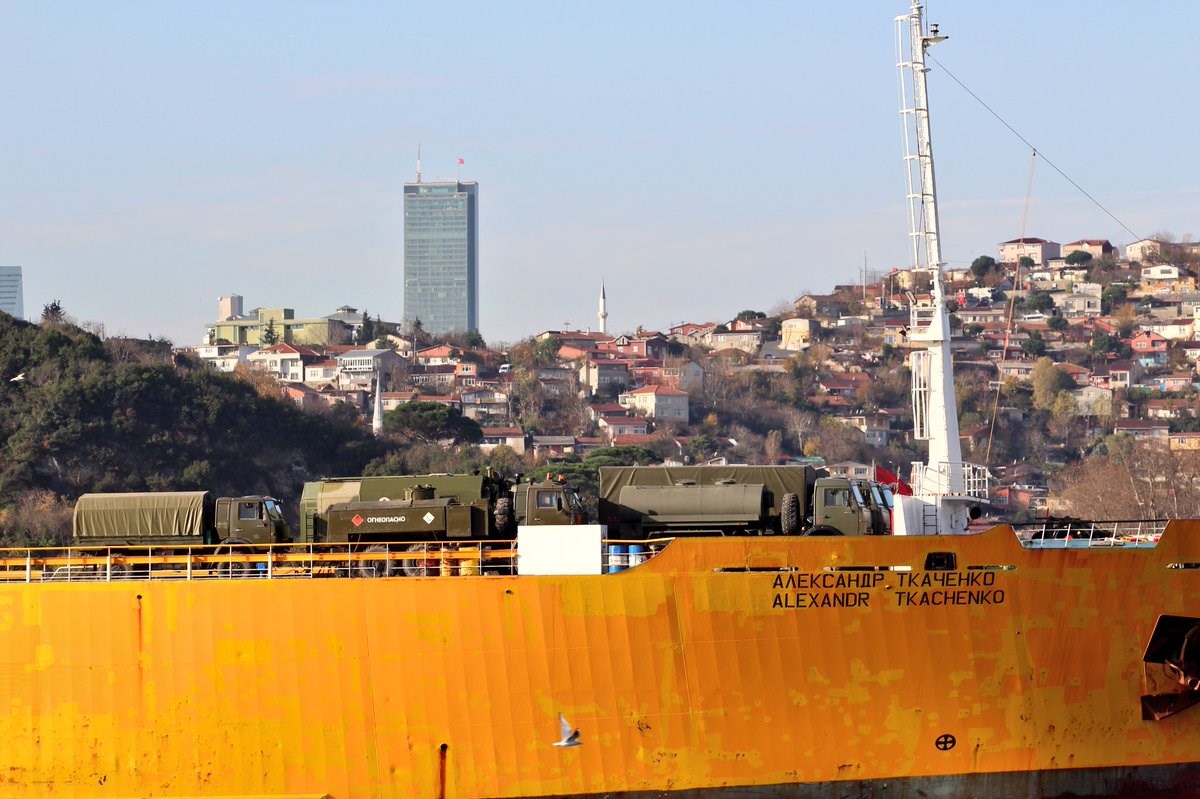 В сети появились фотографии, на которых запечатлено грузовое судно с военной техникой, которое возвращается из Сирии в Россию.
