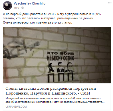 Так, Вячеслав Чечило на своей странице в Facebook говорит о том, что "не первый день работает в СМИ и может с уверенностью в 99,9% сказать, что это заказной материал, размещенный за деньги. Очень интересно, кто именно за это заплатил", - пишет он.