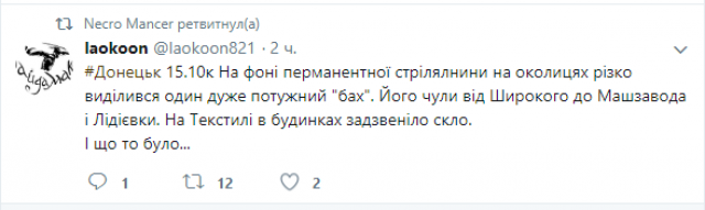 «15.12. Донецк. Машзавод. Мощно шото шарахнуло, в доме через музыку подскочила. Вроде со стороны дурки, но точно не разобрала».