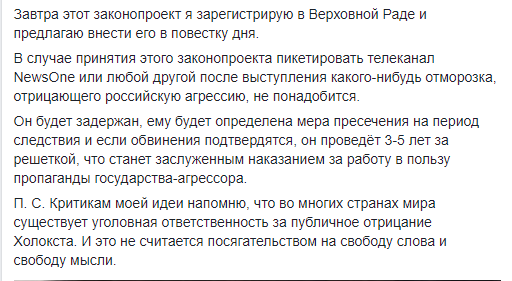По его словам, закон нужен «для того, чтобы защитить информационное пространство Украины от «мураевщины» и использовать силу закона». Нардеп добавил, что уголовная ответственность за факт отрицания агрессии РФ предусматривается до 5 лет лишения свободы.