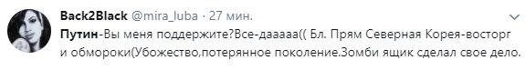 «Если Путин победит, то к 2024 году его президентский срок составит 21 год. Приятного проживания», «Путин будет имитировать выборы РФ вместе с другими кандидатами. Значит перегоним Руанду, Буркина-Фасо и Науру. Все, идите готовиться жрать лебеду и пишите завещание», «Недолго мучилась старушка», «Путин — вы меня поддержите? Все — да! Прям Северная Корея, восторг и обмороки. Убожество, потерянное поколение. Зомби ящик сделал свое дело», «Какая клоунада: Путин заходит на завод и работяги, чьи доходы уже четвертый год падают в результате политики президента начинают кричать «Мы за вас!» — писали в сети.