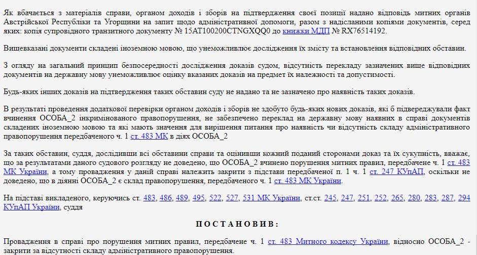 Учитывая эти факты, таможенники потребовали привлечь к административной ответственности директора ООО «Атриа лайн», однако сделать это не удалось. В марте 2017 г. Соломенский районный суд Киева закрыл производство по целому ряду таких эпизодов на десятки миллионов гривен. Основанием для этого судья Владлена Лазаренко назвала отсутствие перевода копий документов, предоставленных украинской стороне таможенными органами Австрии и Венгрии. Будет ли в следующем году Лазаренко вносить в свою новую декларацию одежду премиальных брендов, как это делают многие прогрессивные люди — неизвстно.