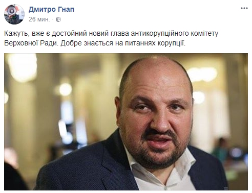 «Говорят, уже достоин новый глава антикоррупционного комитета Верховной Рады. Хорошо разбирается в вопросах коррупции«, — намекает на кандидатуру Борислава Розенблата журналист Дмитрий Гнап.