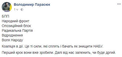 «БПП, «Народный фронт», Оппозиционный блок, Радикальная партия, «Видродження», «Воля народа». Коалиция в действии. Это те силы, которые спят и видят как уничтожить НАБУ. Первый шаг они уже сделали. Дальше от нас зависит, будет ли второй«, — предвидит ситуацию нардеп Владимир Парасюк.