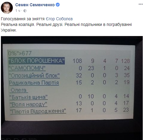 «Голосование за снятие Егора Соболева«, — показывает результаты народный депутат Семен Семенченко. — «Реальная коалиция. Реальные друзья. Реальные подельники в ограблении Украины«.