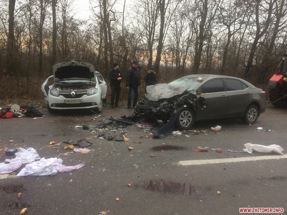 Дорожно-транспортное происшествие случилось в субботу, 9 декабря, на трассе Бердычев - Хмельник. Водитель легкового автомобиля Renault на закругленном участке дороги выехал на встречную полосу, где в авто врезалась Toyota.