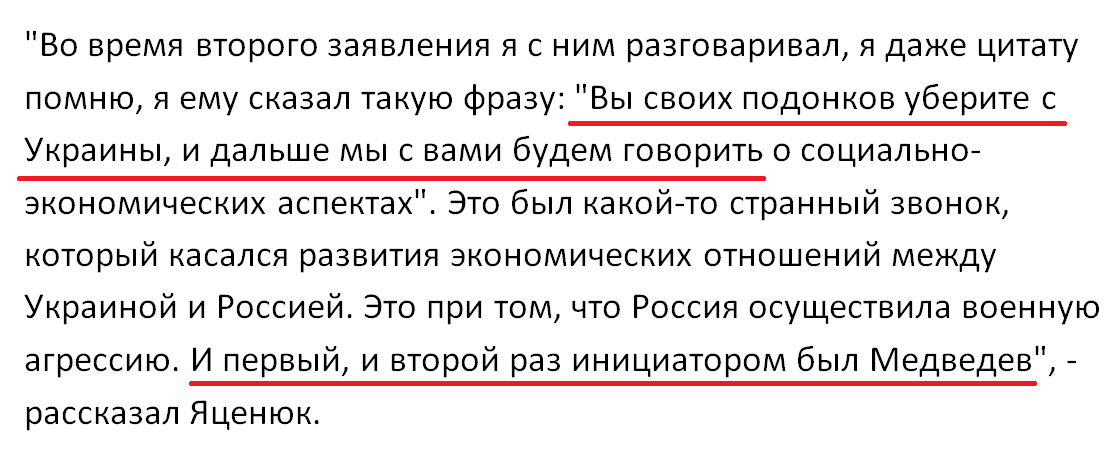 Собственные признания Яценюк озвучил в ходе допроса в киевском суде в деле о государственной измене Януковича. Яценюк признался, что в начале 2014 года было 2 телефонных звонка, при этом в обоих случаях инициировал разговор Медведев.