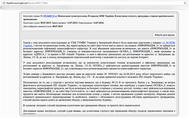 ЧП “Ізідейт Україна” зарегистрировано по адресу Запорожье, пр. Металлургов, 2 с 1 июля 2016-го года. До этого предприятие было прописано на проспекте Ленина 131-Б. В 2015-м году ЧП “Ізідейт Україна” фигурировало в уголовном деле о распространении порнографии. Далее выписка из реестра судебных решений по делу № 335/6605/15-к 1-кс/335/3391/2015: