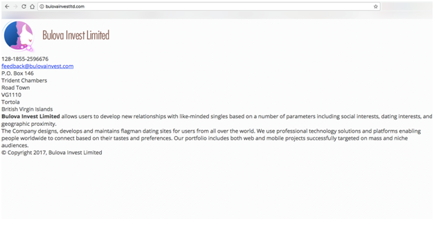 Компания работает официально и прописана на Британских Виргинских островах. Согласно данным с официального сайта, Bulova разрабатывает и поддерживает работу дейтинговых сайтов по всему миру.