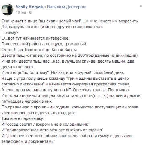 На своїй сторінці у Facebook колишній військовий, нині – патрульний, Василь Коряк зізнався: дуже часто їм дорікають, що надто довго їхали за викликом. Від звинувачень не відхрещуються, але вдіяти нічого не можуть: встигнути всюди, коли бракує автомобілів, нереально: