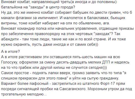 «Найпростіше — підняти лапки вгору, голосно заявити щось типу «я занадто прекрасний для цього гівна». Варіант більш пафосний — застрелитися з штатного Форт-17 прям посеред сигналячого затору на Саксаганського. Морозним ранком та під зворушливу мелодію