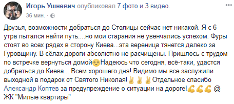 "Друзья, возможности добраться до Столицы сейчас нет никакой. Я с 6 утра пытался найти путь... Но мои старания не увенчались успехом. Фуры стоят во всех рядах в сторону Киева, эта вереница тянется далеко за Гуровщину. В селах дороги абсолютно не расчищены. Пришлось с трудом по встречке вернуться домой. Надеюсь что сегодня, всё-таки, удастся добраться до Киева", - написал он около 7 утра.