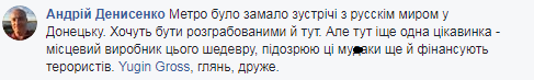 "Метро было мало встречи с русским миром в Донецке. Хотят быть разграбленными и здесь. Но здесь еще одна изюминка - местный производитель этого шедевра, подозреваю эти му*аки еще и финансируют террористов", – отметил он.