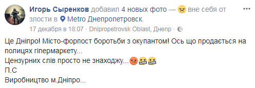 "Это Днепр! Город-форпост борьбы с оккупантом! Вот что продается на полках гипермаркета. Цензурных слов просто не нахожу", – написал Сыренков.