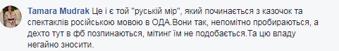"Это и есть тот "русской мир", который начинается со сказок и спектаклей на русском языке в ОГА. Они так незаметно проникают, а некоторые здесь в фб распинаются, митинг им не нравится.Та эту власть немедленно сносить", – возмутилась Тамара Мудрак.