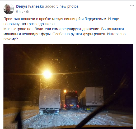 "Простоял полночи в пробке между Винницей и Бердичевым. И еще половину – на трассе до Киева. МЧС в стране нет. Водители сами регулируют движение", – написал журналист Денис Иванеско.