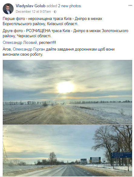 "Первое фото – нерасчищенная трасса Киев-Днепр в пределах Бориспольского района Киевской области. Второе фото – расчищенная трасса Киев-Днепр в пределах Золотоношского района Черкасской области. Александр Лесной, респект! Эй, Александр Горган, дайте задание дорожникам, чтобы они выполнили свою работу", – написал в Facebook внефракционный народный депутат Владислав Голуб еще 12 декабря – до разгула стихии.
