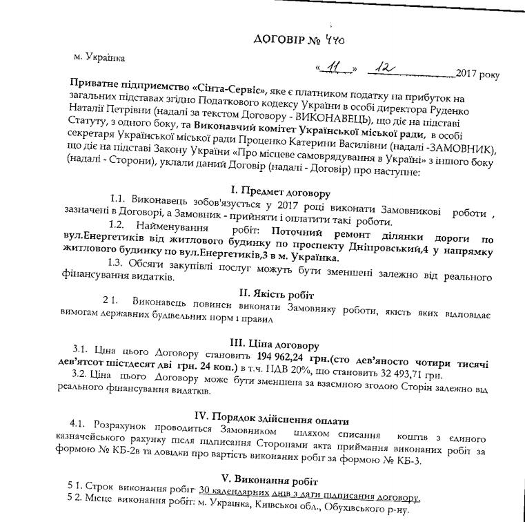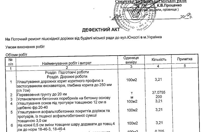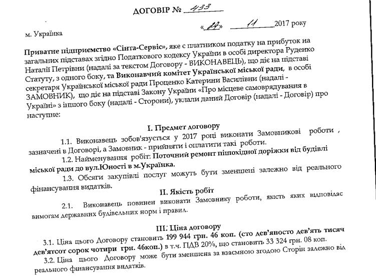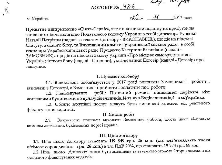 На тому ж тижні виконком Українки уклав ще один договір на ремонт пішохідної доріжки в іншому місці – від будівлі міської ради до вул.Юності в м. Українка вартістю 199 944,46 грн. Виконавець – той самий.