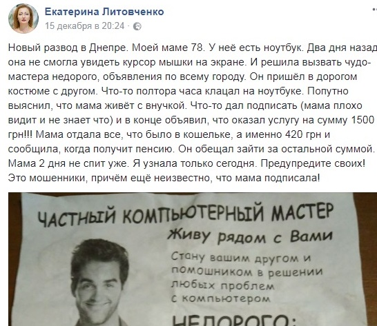 На своей странице в социальной сети Фейсбук Екатерина Литовченко сделала публикацию о том, как компьютерных дел мастер обманул ее маму. Как оказалось, семидесятивосьмилетняя женщина на экране ноутбука не увидела курсор мышки и решила воспользоваться предложением Алексея. По вызову пришли хорошо одетые парни, которые более часа что-то делали, попутно выведывая, с кем живет женщина. После окончания «работы» Алексей дал пенсионерке на подпись какие-то бумаги. Женщина подписала документы не особо вчитываясь в смысл написанного. После того компьютерщик заявил, что оказал услугу стоимостью в 1500 гривен. В кошельке женщины было лишь 420 гривен, которые мошенник забрал и сказал, что зайдет за оставшейся суммой.
