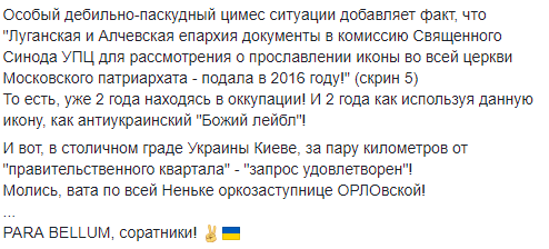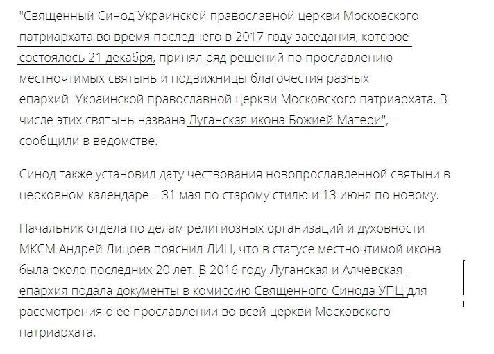 "Местночтимая на территории Луганско-Алчевской епархии с 1998 года икона Божьей Матери "Луганская" - переведена в разряд всецерковно почитаемых икон. С соответствующими "Днями почитания" и т.п. С 2014 года данная икона является одним из, если не основным "Божьим охранительным лейблом" в борьбе ОРЛОвцев против Украины и за "русский мир" на Луганщине", - сообщил он.