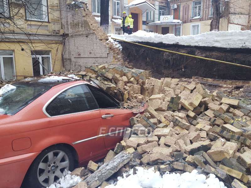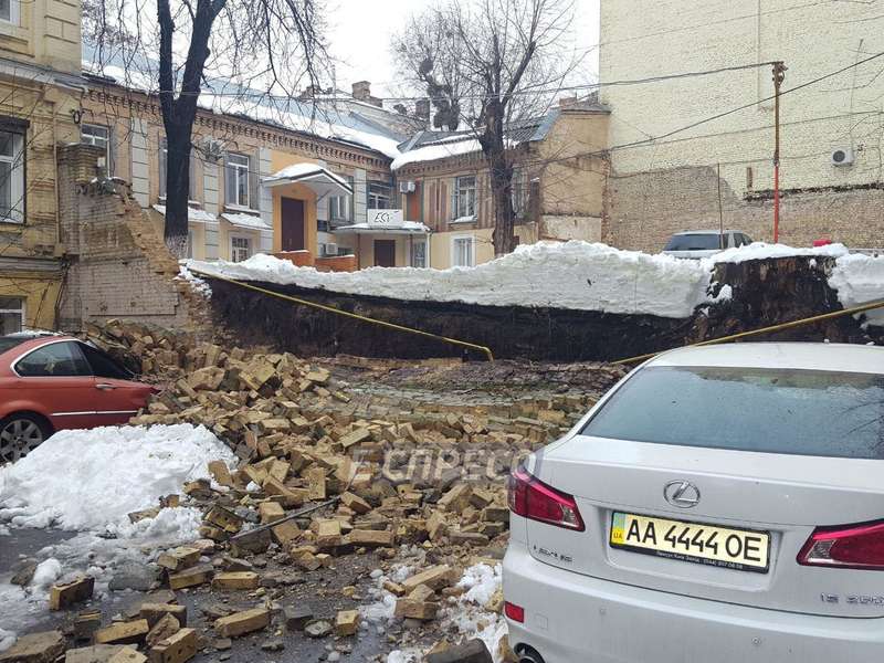 В центре Киева обвалилась стена между домами, раздавив две машины