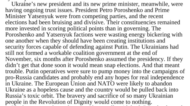 «Я сделал последний из многих срочных звонков Януковичу в конце февраля 2014 года, когда его снайперы убивали украинских граждан десятками и у нас были достоверные сведения о том, что он готовит еще более жесткий разгон. Я несколько месяцев обращал его внимание на то, что он должен проявлять сдержанность в отношениях со своими гражданами, но в ту ночь, спустя три месяца после начала протестов, я сказал ему, что все кончено. Пришло время отзывать своих боевиков, и он ушел. Я напомнил ему, что его единственными реальными сторонниками были политические покровители и манипуляторы в Кремле и что ему не стоит ожидать, что русские друзья спасут его от этой катастрофы. Я отметил, что Янукович потерял доверие украинского народа и что история жестоко накажет его, если он будет продолжать убивать людей. Униженный, Янукович бежал с Украины на следующий день — благодаря мужеству и решимости протестующих, — и контроль над государством временно оказался в руках молодого патриота по имени Арсений Яценюк».