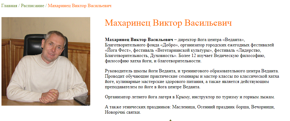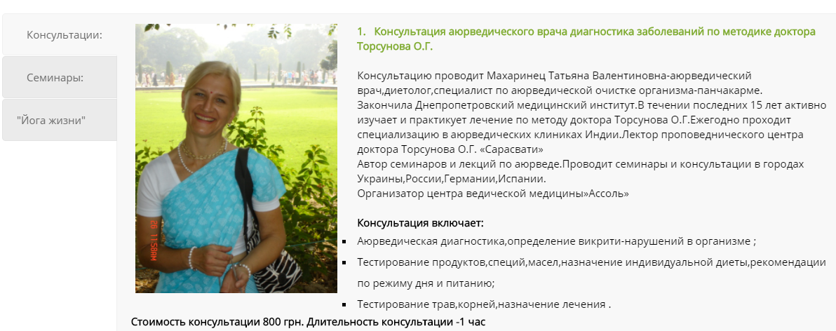 Мать Татьяна Махаринец считается специалистом по юрведической очистке и диетологии. Проводит семинары и консультации в городах Украины, России, Испании и Германии. Является организатором центра ведической медицины "Ассоль". Ее услуги стоят достаточно дорого - 600-800 гривен за час.