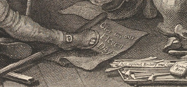 Уильям Хогарт, «Предвыборный пир». Виги отбили несколько трофеев. Среди них — транспарант с надписью «Give us our Eleven Days» — «Отдайте нам наши Одиннадцать дней!» За окном видно, что митинг продолжается