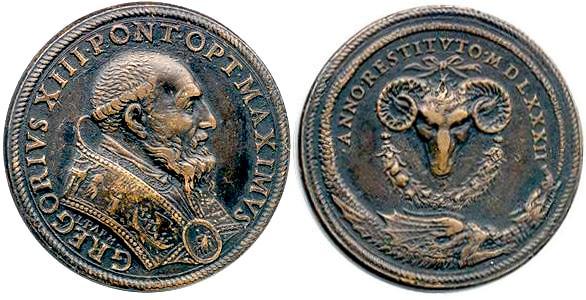 Затем была отчеканена памятная медаль. На одной стороне медали — Папа. А на второй — овца. Вернее, Агнец. Вернее — зодиакальный Овен. И дракон, схвативший себя зубами за хвост. И надпись: Год исправления 1582. Что означает весь этот ребус?