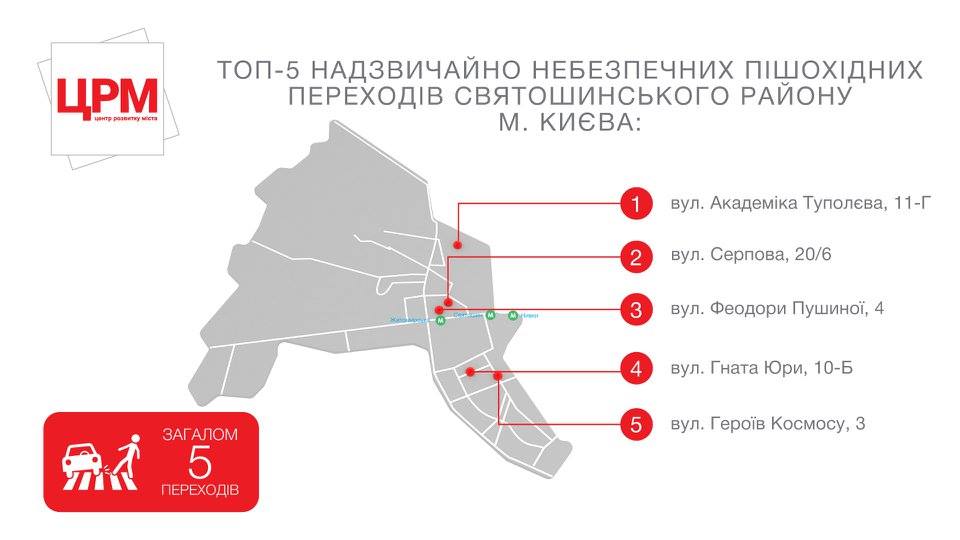 По информации активистов, больше всего опасных переходов для всех участников дорожного движения находятся в Оболонском районе — 54. Еще 40 пешеходных переходов опасны для движения в Деснянском районе, 33 — в Дарницком.