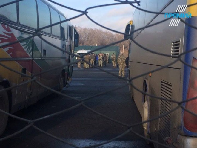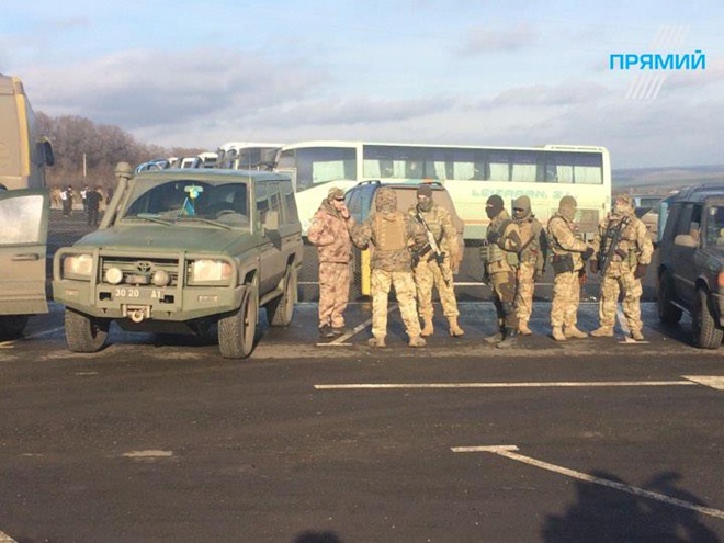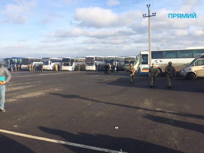 14:22. На подконтрольную территорию приехали 3 автобуса. В одном - 16 человек пленных, во втором - сепаратистские и российские СМИ, в третьем - представители "ЛНР".