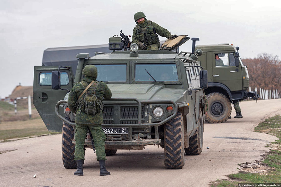28 февраля 2014 года – военный спецназ РФ без опознавательных знаков захватил аэропорты «Симферополь» и «Бельбек» (Севастополь). 11 русских боевых вертолётов МИ-24 вторглись со стороны России в Крым. 8 русских военно-транспортных самолётов ИЛ-76 приземлились на аэродром «Гвардейское» у Симферополя. Было заявлено, что самолёты планируют совершать посадки каждые 15 минут без участия Госпогранслужбы Украины. Со стороны Севастополя и со стороны аэродрома «Гвардейское» в сторону Симферополя выдвинулось несколько десятков единиц прибывшей бронетехники, среди которых наблюдались бронемашины «Тигр» и другие образцы техники и вооружения, которых не было ранее у войсковых частей РФ в Крыму. Отряд морской охраны Госпогранслужбы Украины в Балаклаве окружили неизвестные вооруженные люди.