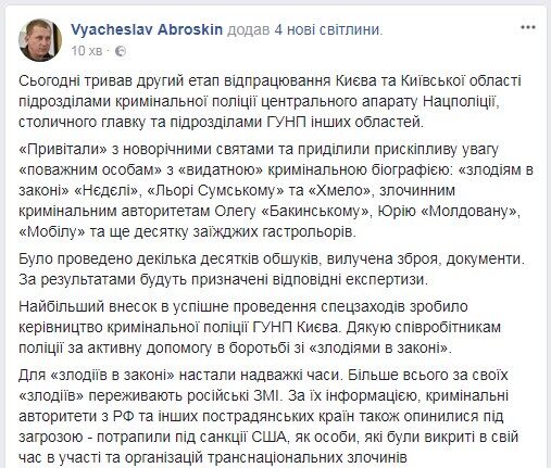 Об этом рассказал в своем Facebook первый заместитель главы Нацполиции Украины – начальник криминальной полиции Вячеслав Аброськин.