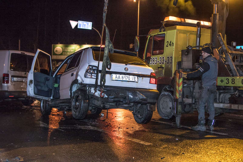На Большой Окружной на повороте на Бучу столкнулись Honda, Volkswagen, Skoda, Mercedes и Hyundai. Скорая помощь увезла одного водителя и пассажира.