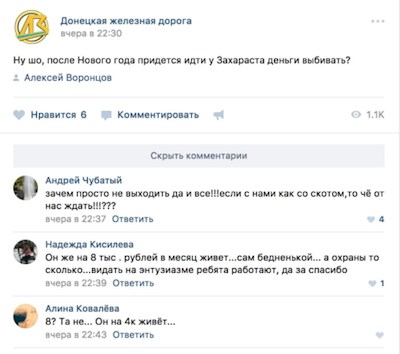 "У донецких железнодорожников новый год не задался. "ДНРовцы" не заплатили денег", - написал он, приложив соответствующие скриншоты с их возмущением в соцсетях.