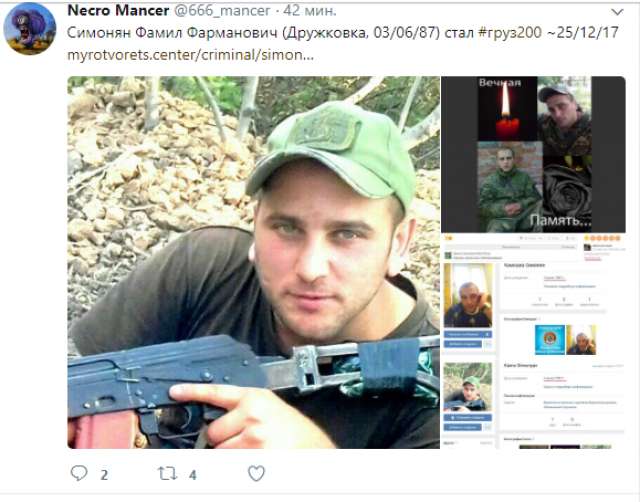 Украинский блогер Necro Mancer на своей странице в соцсети сообщил, что Симонян родился 03/06/87 в Дружковке. По данным соцсетей, боевика ликвидировали 25/12/17.