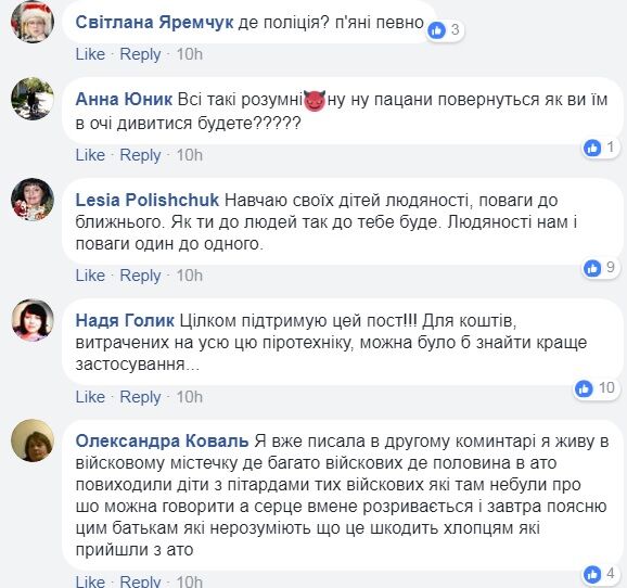 "Было время, когда я гордилась, что я львовянка, когда я в любом уголке мира за достоинство львовян "боролись" до изнеможения, но сейчас - мне стыдно! Мы удивительным образом стали негодяями, которым безразлична, чья-то боль. Неужели те салюты или петарды важнее спокойного сна и уважения к тем, кто был на войне? Вы ходите от клуба к клубу от генделика к генделику и для вас жизненно важно запустить салют?" - возмутилась она.