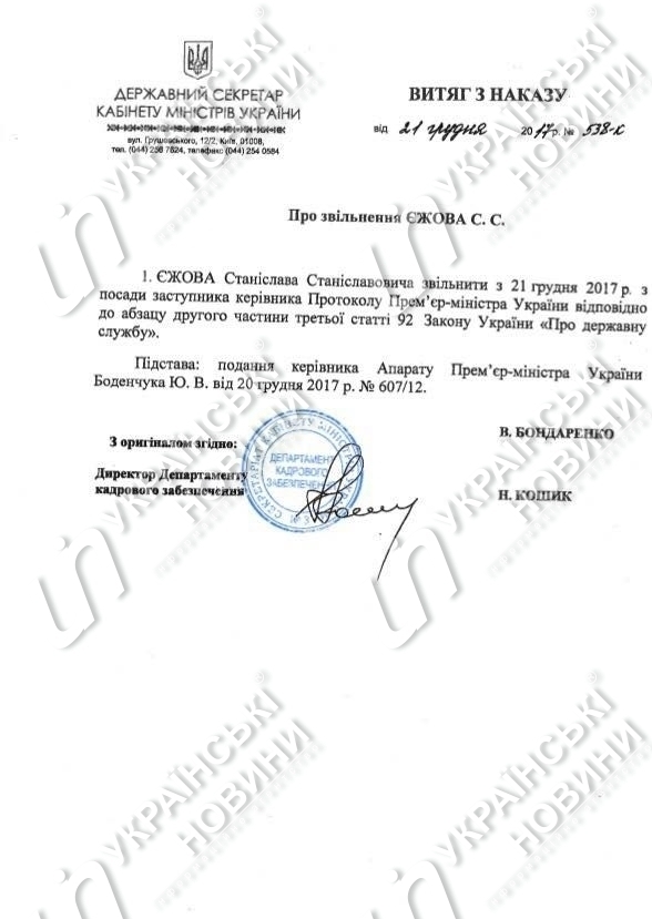 "Ежов Станислав Станиславович уволен с 21.12.2017 с должности заместителя руководителя протокола премьер-министра в соответствии с приказом государственного секретаря Кабинета Министров", - говорится в сообщении.