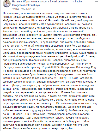 "...Он попал на глаза компании отморозков, которые в новогоднюю ночь искали жертву. Этой жертвой стал мой сын: они забрали у него телефон, кошелек, паспорт, но .... Эта быдлота начала его зверски избивать. Их было пятеро, бил каждый, добивали битой, потому что хотели убить. Когда мой сын потерял сознание, они его оставили умирать на дороге .... Как мы его нашли, как он выжил, как его мы целый день перевозили по трем больницах описывать не буду", - рассказала она.