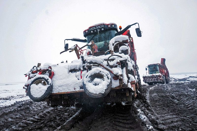 1400 гектаров заснеженных сельскохозяйственных угодий, сейчас превращённых рычащими красными грузовиками и густое черное месиво, могли бы представлять картину процветания сельского хозяйства.
