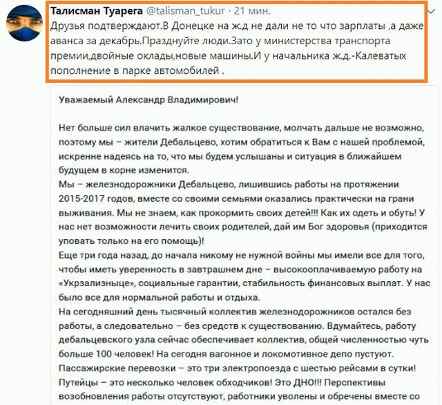«В Донецке на ЖД не дали не то что зарплаты, а даже аванса за декабрь. Празднуйте, люди. Зато у министерства транспорта премии, двойные оклады, новые машины…»