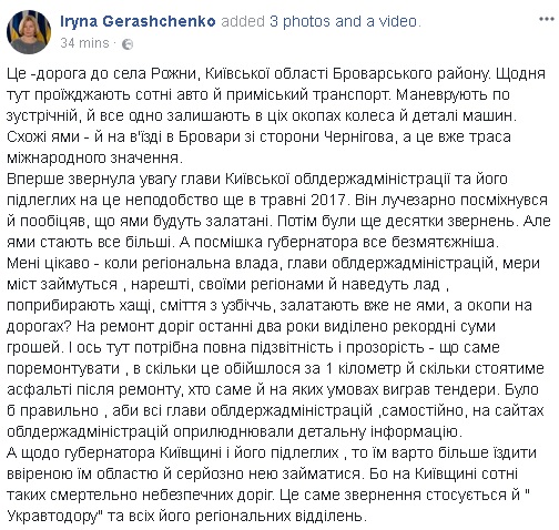 Уполномоченная президента по вопросам мирного урегулирования конфликта в Донецкой и Луганской областях Ирина Геращенко заявила о катастрофическом состоянии дорог в Киевской области.
