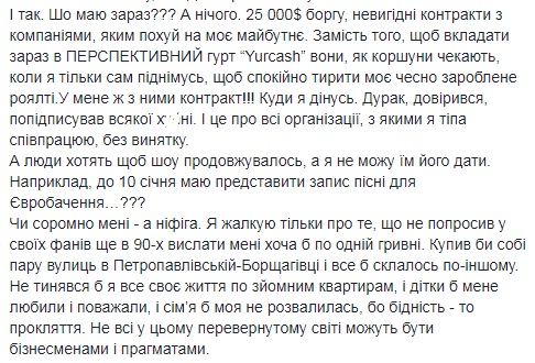 "А люди хотят чтобы шоу продолжалось, а я не могу им его дать. Например, до 10 января я должен представить запись песни для "Евровидения", - пишет Юрченко.