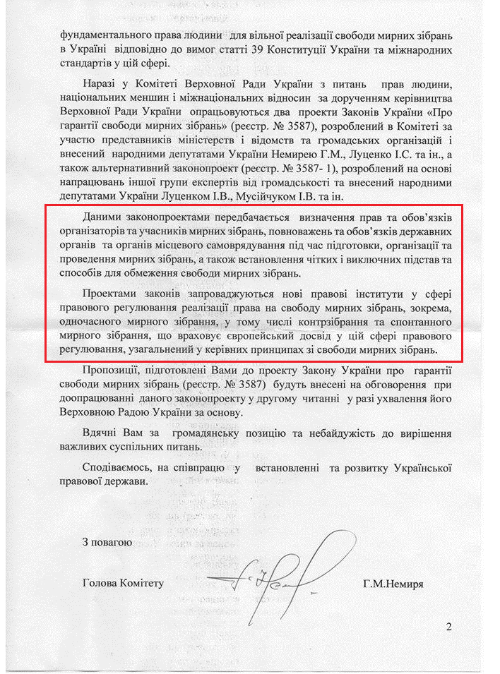 На розгляді в парламентському комітеті з питань прав людини перебуває проект Закону України «Про гарантії мирних зібрань» (№3587 від 07.12.2015 р.) за співавторством голови комітету, народного депутата України Немирі Григорія Михайловича.