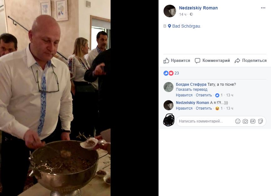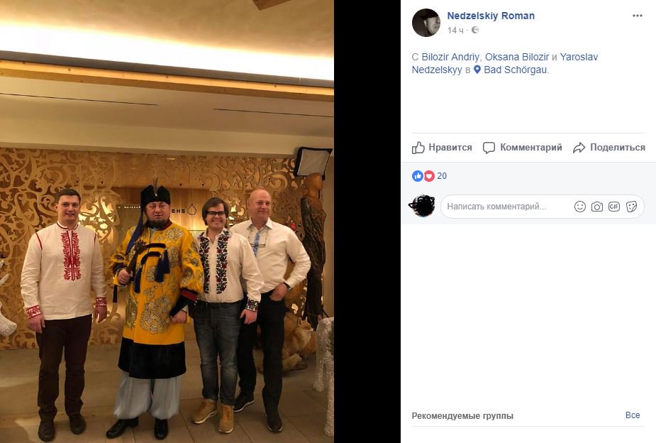 Специально для праздника миллиардер Герега приобрел черно-желтый жупан с вышивкой, серые шаровары, казацкую шапку, а также взял в руки булаву. Нелзельский на фотографиях также присутствует — без особенного костюма с булавой.